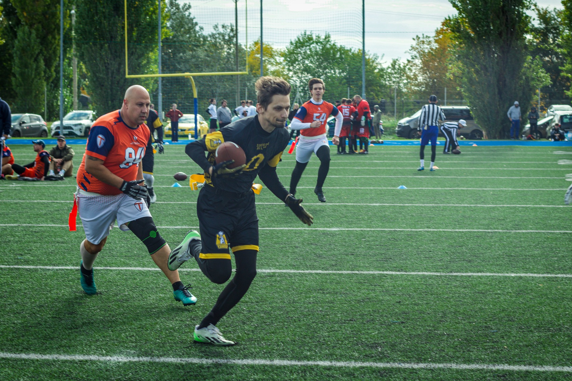 A védelem gyorsan leparancsolta a Titánokat, negyedikre Bencének volt egy gyönyörű leütése. A második támadásunk ismét nehezen indult: két hosszú passz is sikertelen lett, majd Gyuri közepes haladását követően Balázs szépen kimozogva szerezte meg először a first downt, ezt követően pedig sikeresen bevitte a touchdown-t is. A Titans összeszedte magát, és a következő drive-ban szépítettek 13–6-ra. Minimális idő maradt a félidőből, Botond feldobta a labdát egész pályán át Levinek, aki el is kapta a TD-t, így 19–6-os állásnál mehettünk félidőre.