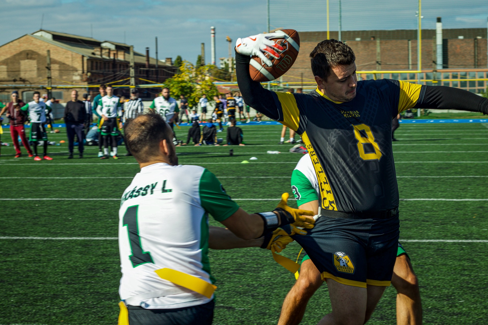 Mi kezdtük a mérkőzést. A nyögvenyelősen induló támadás során a first downt Gyuri szállította negyedikre, egy hosszú elkapás után, majd a Titans térfelén első kísérletre Martin Peti szerezte meg a Millers színeiben az első touchdownját, Balázs pedig feltette a koronát a drive-ra az extrával.