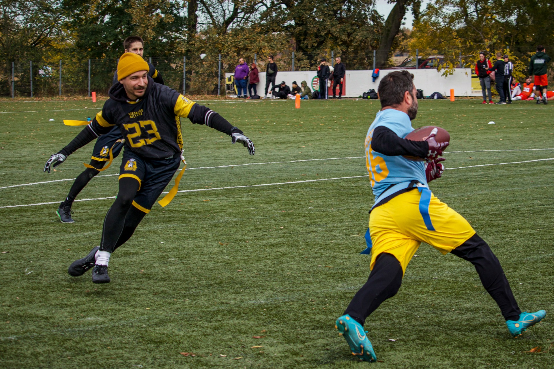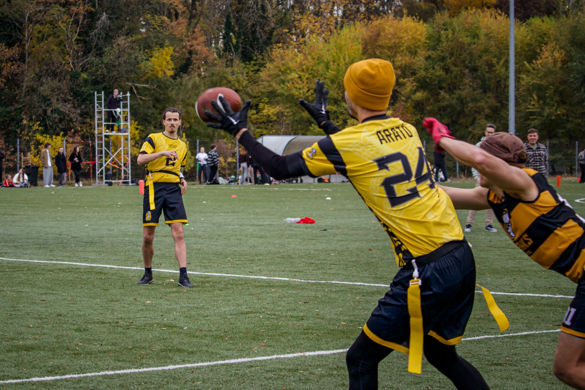 Ennek megfelelő koncentráltsággal kezdtük a meccset, az első támadásunkban két rövid passz után megpróbálta Botond a védelmet meglepni egy hosszú kísérlettel, ami sikerült is, Levi magabiztosan húzta be az átadást, majd ezt követően az extrapontot is magára vállalta. A védelmünk domináns formájában érkezett, először Roli szerzett egy interceptiont, amit aztán mélyen a Bullets térfelére vissza is hordott, utána Botondnak volt egy hosszú Bullets passzt követően labdaszerzése. A Roli adta lehetőséget a támadók is kihasználták, Gábor kapott el TD-t, amivel el is húztunk 13-0-ra. Mivel a védelem kitartóan állta a sarat, a félidőre is ezzel az előnnyel vonulhattunk.